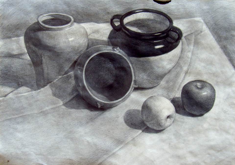 今天看到一幅素描習(xí)作,不僅想起了學(xué)生時代。這副素描先要看出自哪個年齡層的,如果是一個高中生或者大一的,只能說還過得去。如果說不足,我覺得首先這只是一幅普通的素描學(xué)生習(xí)作,不能稱之為素描作品。雖然現(xiàn)在投身株洲廣告事業(yè),但是一直割舍不下藝術(shù)情節(jié),對自己當(dāng)年繪畫達到的水平還是很有信心。作品是需要打動人的情感,我看了這副素描沒有看到感動與創(chuàng)作,給人的感覺太板太死,線條運用不夠靈活,亂,膩。特別是造型不夠好,壇子和館子的形都變了,空間感與物體的質(zhì)感有待加強。