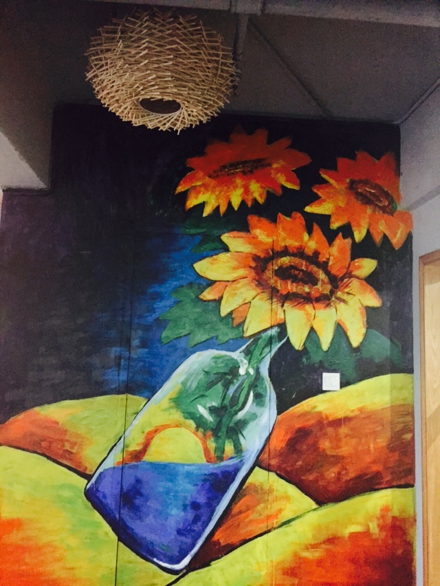 這是一個壁畫,是我們老大親自一筆一劃很辛苦畫上去的,一大朵向日葵。這里隱藏了一個門,里面并不是阿里巴巴的財富,而是我們的雜物間。