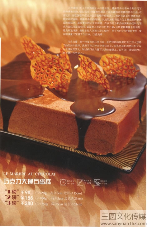 “這種蛋糕1615年由西班牙人引進(jìn)法國,最早是由北昂專業(yè)制作可可的師傅發(fā)明的。但在瑪麗·特雷絲與路易十四大婚前這款蛋糕并不出名,在那之后,這款蛋糕不僅成為法國家喻戶曉的點(diǎn)心,同時(shí)在西班牙也是如此。烘焙此款蛋糕,需要花很長的時(shí)間,以淡奶油和巧克力為主要成分烤制而成的蛋糕體,具有香濃的巧克力味道,而以巧克力和奶油調(diào)制的餡料與巧克力蛋糕坯層層相間,表面淋上些許巧克力醬。這款蛋糕需置于陰涼處,避免高溫場所,最好是放入冰箱內(nèi)冷凍儲存!并于48小時(shí)內(nèi)食用完畢,食用前請置于室溫下5分鐘,口感更棒!